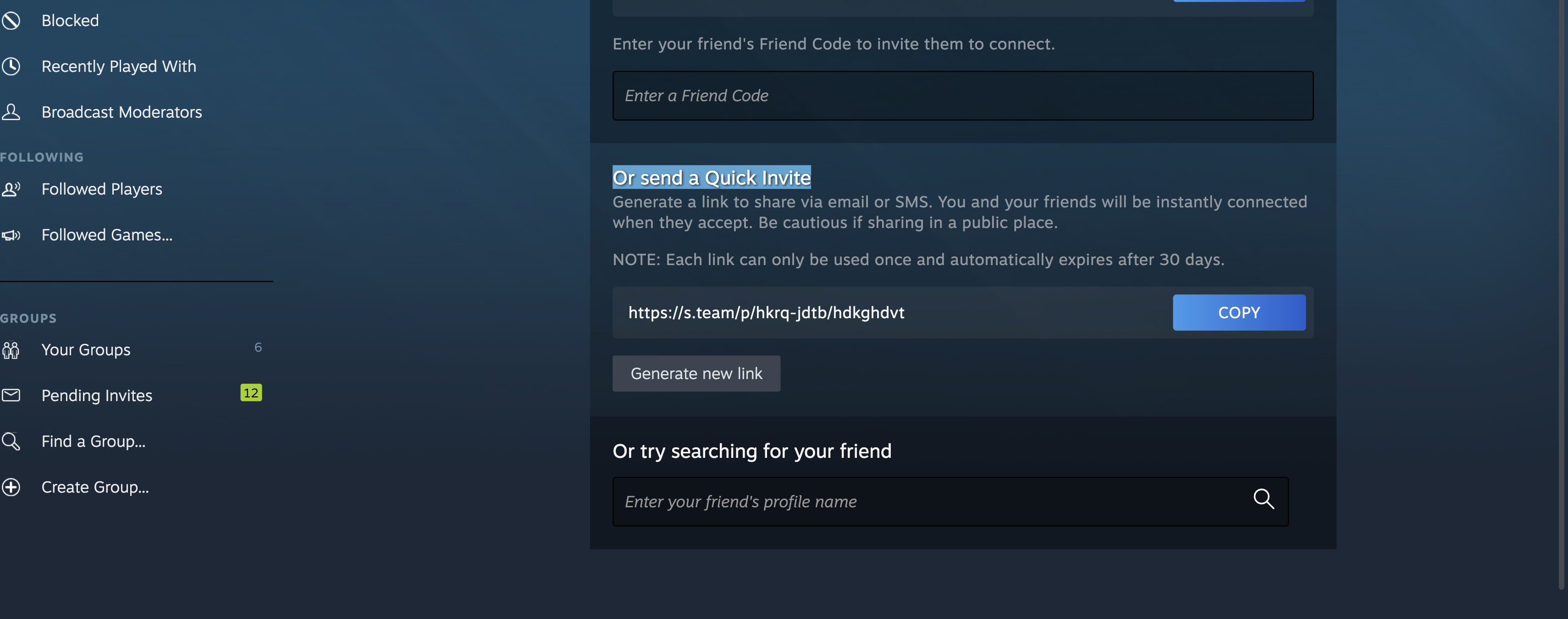 - ส่ง ลิงค์ชวนเพื่อน ให้เพื่อน → ดูได้จากหน้าเพิ่มเพื่อน Steam (กดคัดลอกหรือ Copy ปุ่มสีฟ้าได้เลย) ลิงค์ใช้ได้ 1 ครั้งเท่านั้นหากใช้งานแล้วให้กดสร้างใหม่ด้านล่าง
