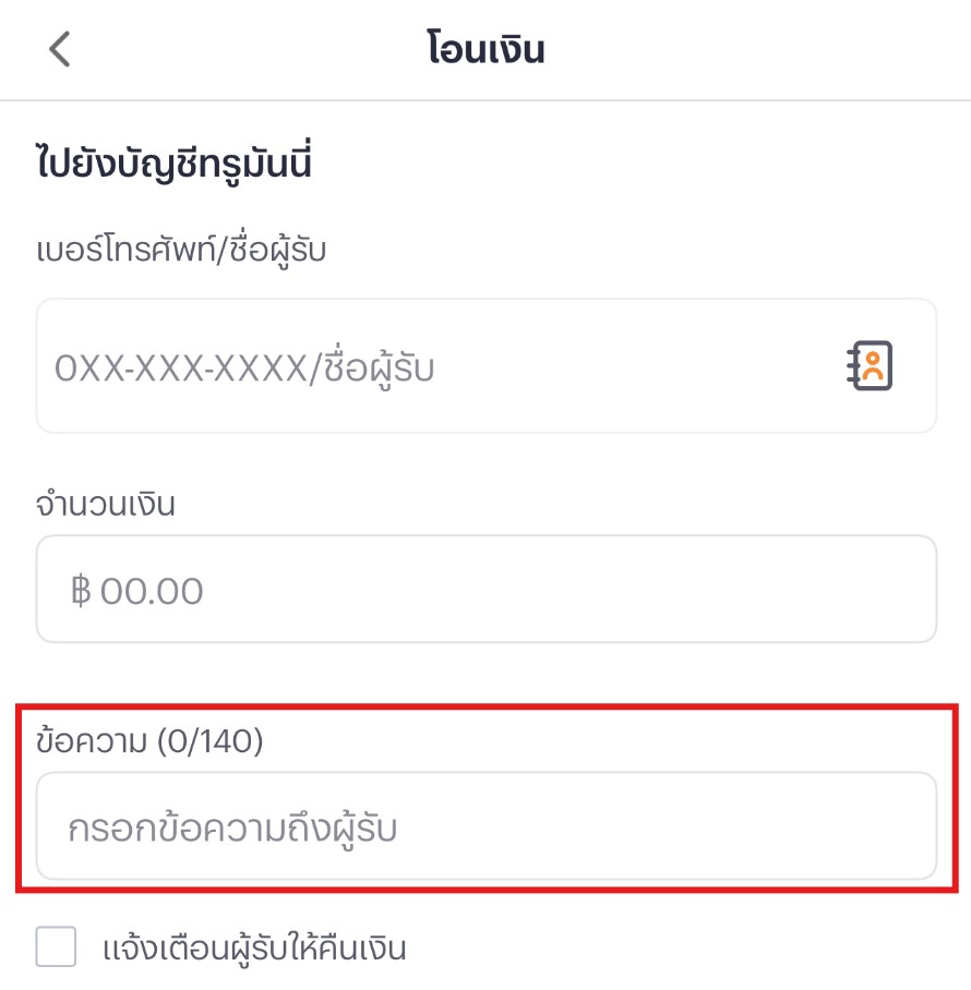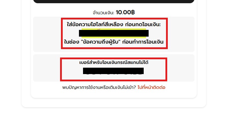 - ใส่เบอร์โทร และ “ข้อความที่เป็นไฮไลต์สีเหลืองให้ครบทั้งหมด โดยไม่ต้องแก้ไขดัดแปลงใด ๆ” แล้วกดโอนเงินได้เลย