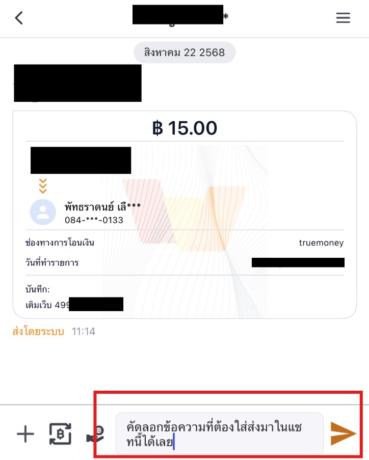- หาแชทที่โอนเงินให้กับทางร้าน และ ส่งข้อความที่ต้องใส่ทั้งหมด เข้ามา