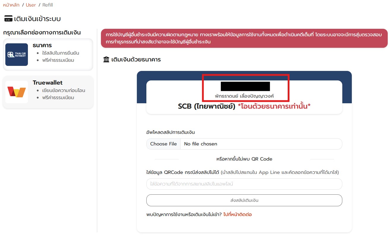 - โอนเงินด้วยเลขบัญชีที่แสดงอยู่บนหน้าเว็บ และเลือกระบุธนาคารให้ถูกต้อง