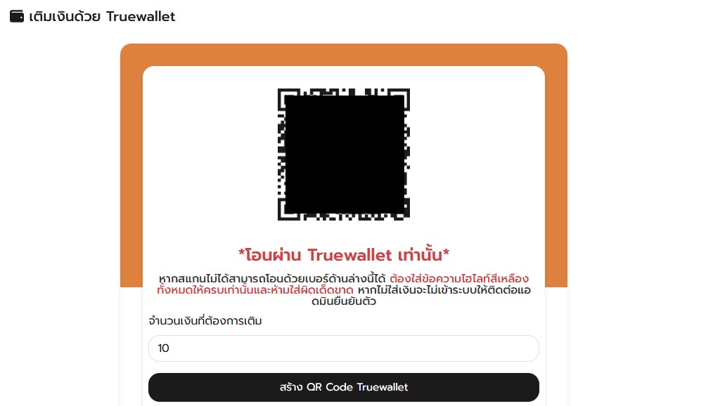 - ใส่ยอดเงินและกดสร้าง QR Code แล้วสแกนเพื่อโอน เงินจะเข้าอัตโนมัติ